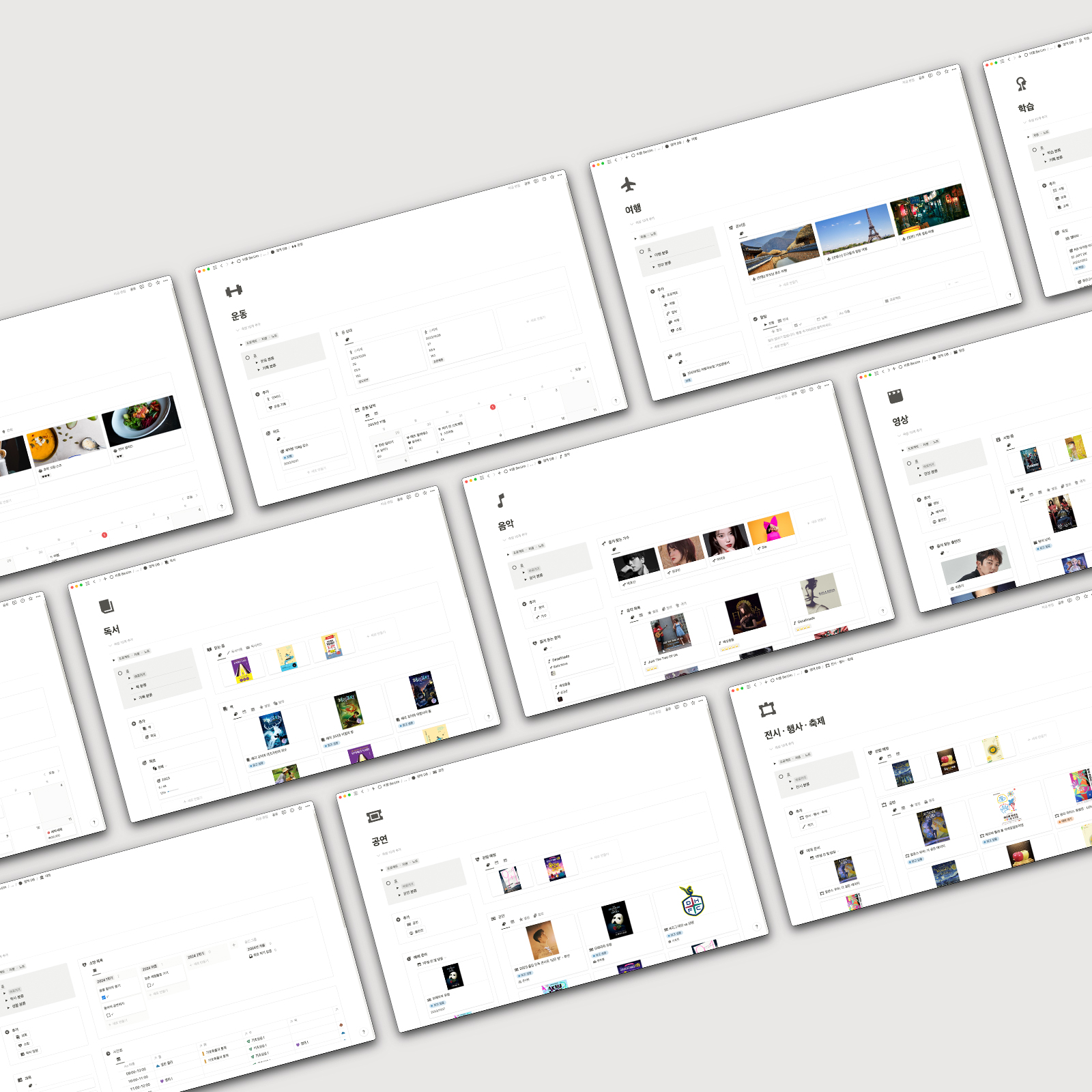 영역 템플릿 : 식단, 운동, 재정, 독서, 여행, 음악, 영상, 공연, 전시, 학습, 대학, 생활, 포트폴리오