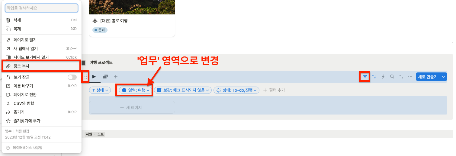 여행 영역에서 프로젝트와 할일을 추가하면